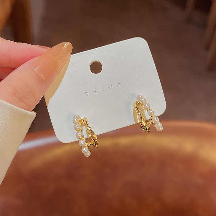 Design Structure: The earrings typically consist of three parallel rows of pearls, often set in a straight or slightly curved line to fit comfortably along the earlobe. The rows can vary in size, with the pearls usually being uniformly small for a delicate appearance or slightly graduated for a more dynamic look.