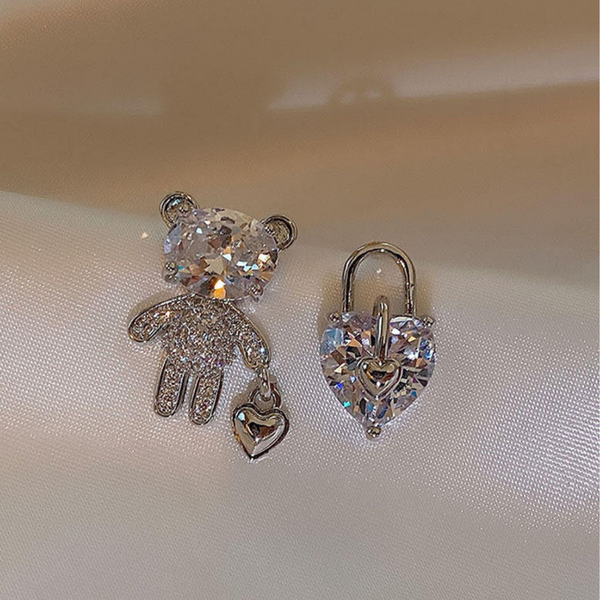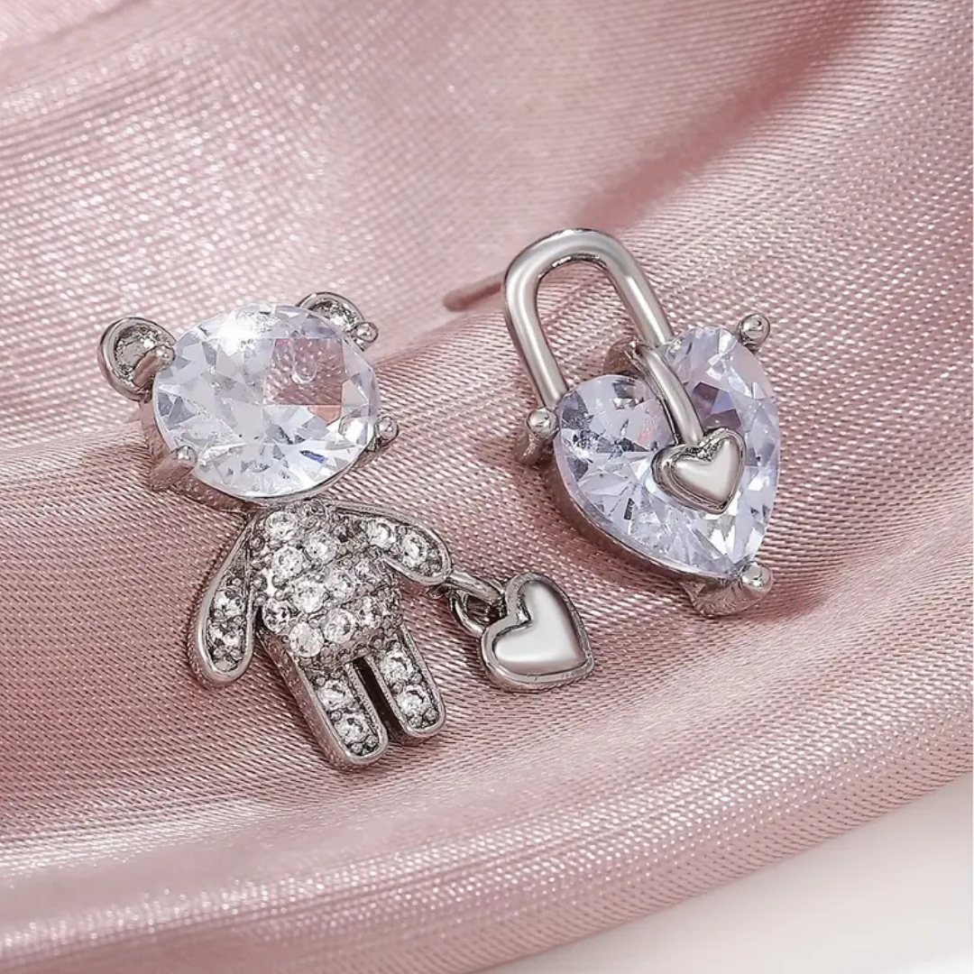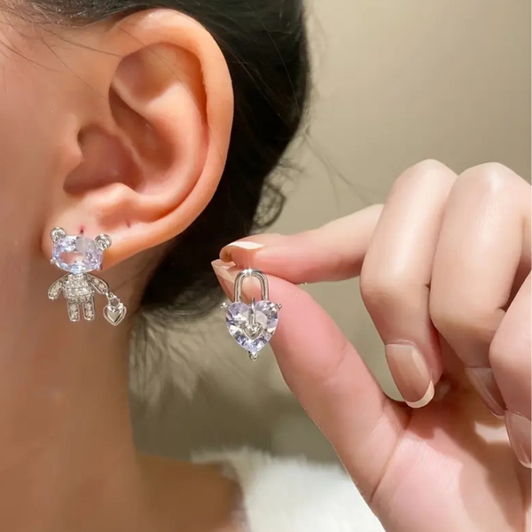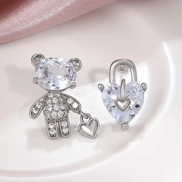 Sparkling Teddy Bear & Heart Lock Earrings