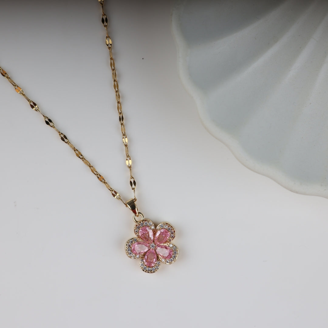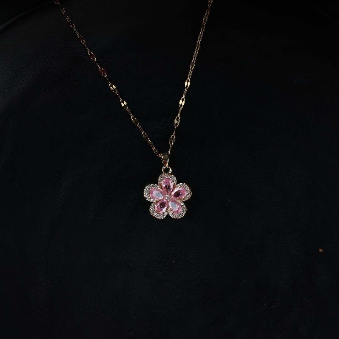 Expertly crafted, this gold plated pink flower pendant necklace is the perfect accessory to elevate any outfit. The intricate design adds a touch of elegance while the gold plating ensures long-lasting shine. Make a statement with this stunning necklace, perfect for any occasion.