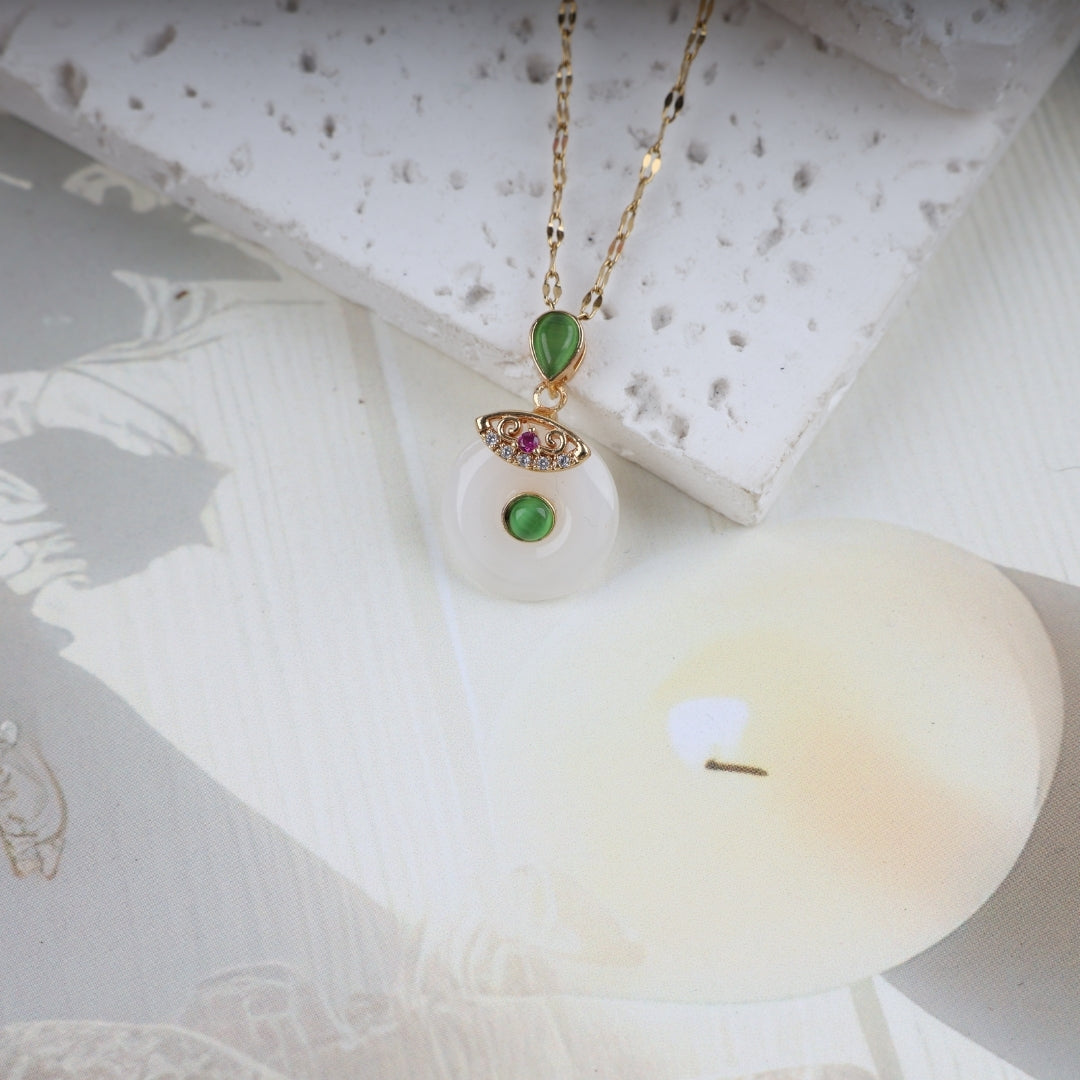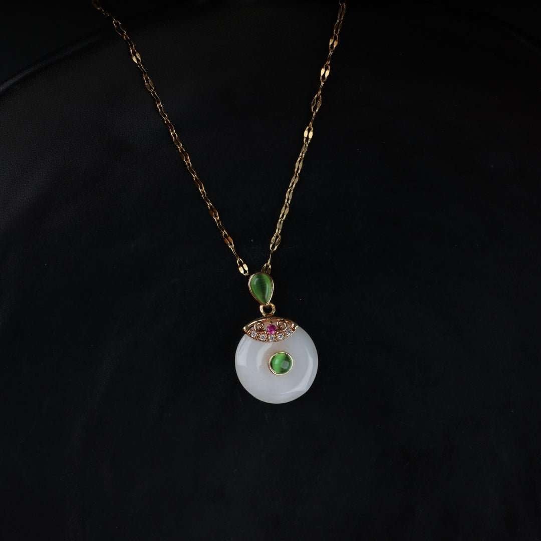 Elevate your style with our White Circular And Green Stone Necklace. This elegant piece features a stunning circular pendant in crisp white complemented by a beautiful green stone. Crafted with quality materials, it's the perfect addition to any outfit. Elevate your look with this timeless piece.