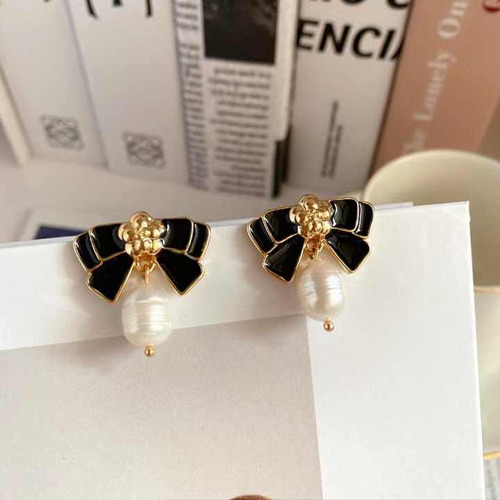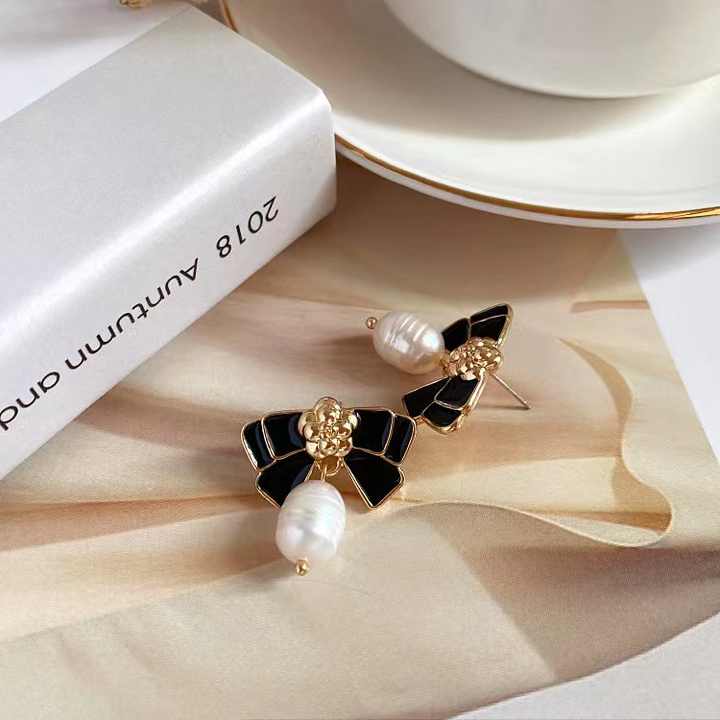 These elegant Black Enamel Bow Pearl Stud Earrings add a touch of sophistication to any outfit. The unique black enamel bow design paired with lustrous pearls creates a timeless look. Made with high-quality materials, these earrings are a must-have for any fashion-forward individual.